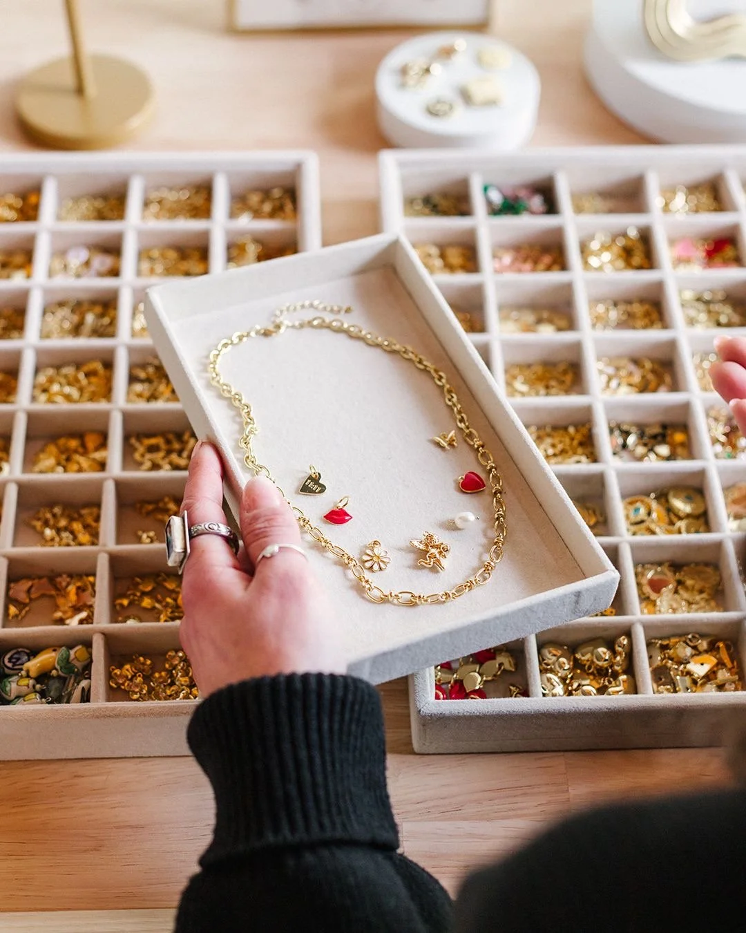 Each guest designs their own custom charm bracelet or necklace using our curated collection of high-quality stainless-steel chains and luxury charms. Every bracelet includes: